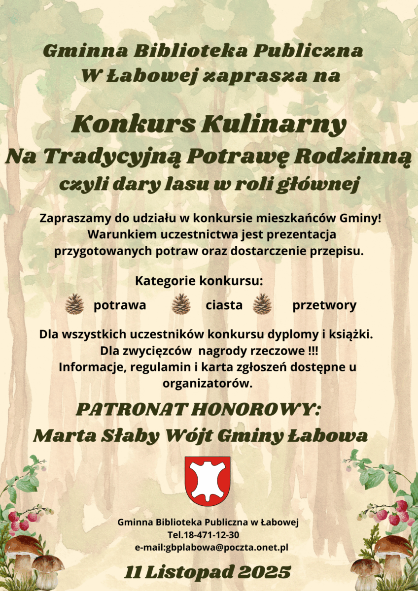 Gminna Biblioteka Publiczna w Łabowej serdecznie zaprasza do udziału w corocznym Konkursie Kulinarnym na Tradycyjną Potrawę Rodzinną, który od lat towarzyszy obchodom Narodowego Święta Niepodległości – 11 listopada.