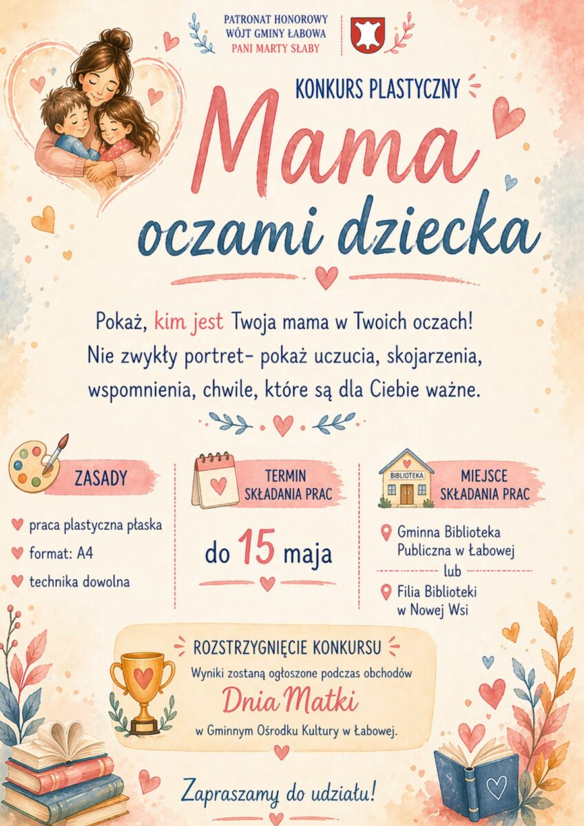 Konkurs plastyczny Dzień Mamy to wyjątkowa propozycja przygotowana przez Gminną Bibliotekę Publiczną w Łabowej. Zapraszamy dzieci do udziału w kreatywnym wydarzeniu, które pozwala spojrzeć na mamę w sposób inny niż zwykle- bardziej emocjonalny, osobisty i pełen znaczeń.