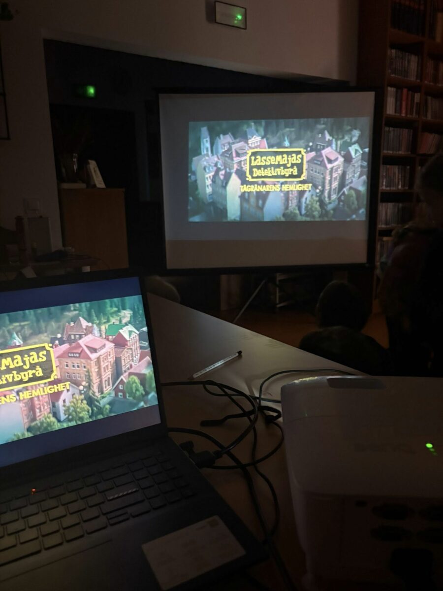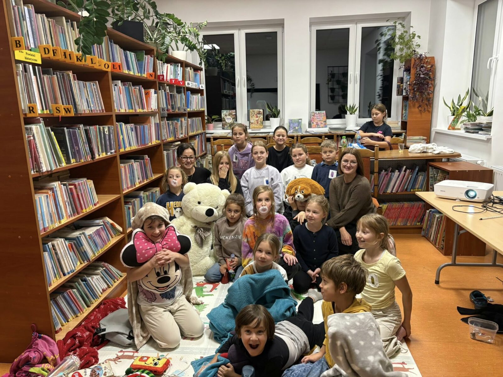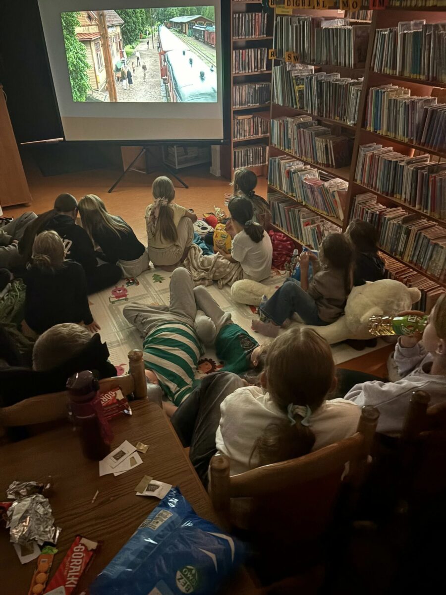 Wieczór zakończyliśmy w przytulnej atmosferze – rozłożyliśmy materace, kocyki i poduszki, by wspólnie obejrzeć film „Biuro Detektywistyczne Lassego i Mai. Rabuś z pociągu”. To był pełen wrażeń i dobrej zabawy wieczór, który udowodnił, że w bibliotece zawsze można przeżyć prawdziwą przygodę!