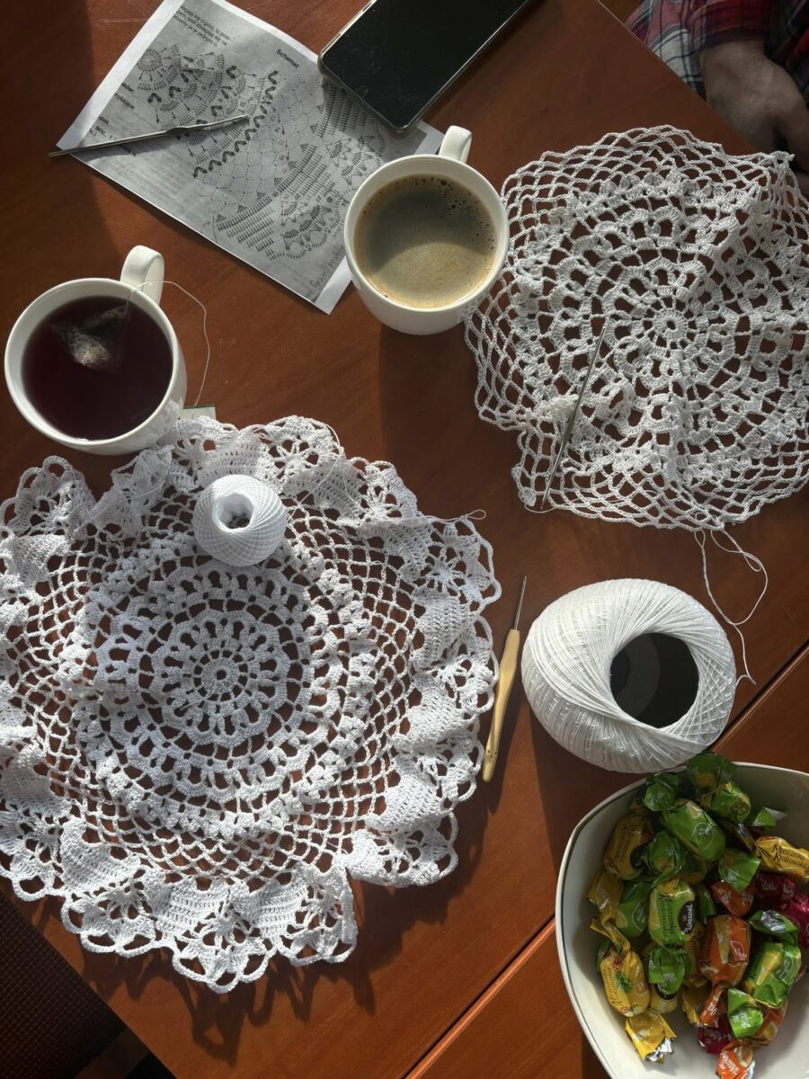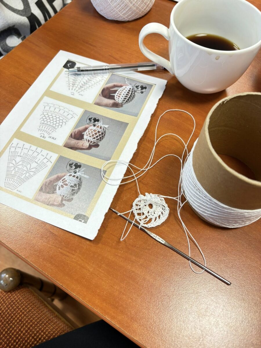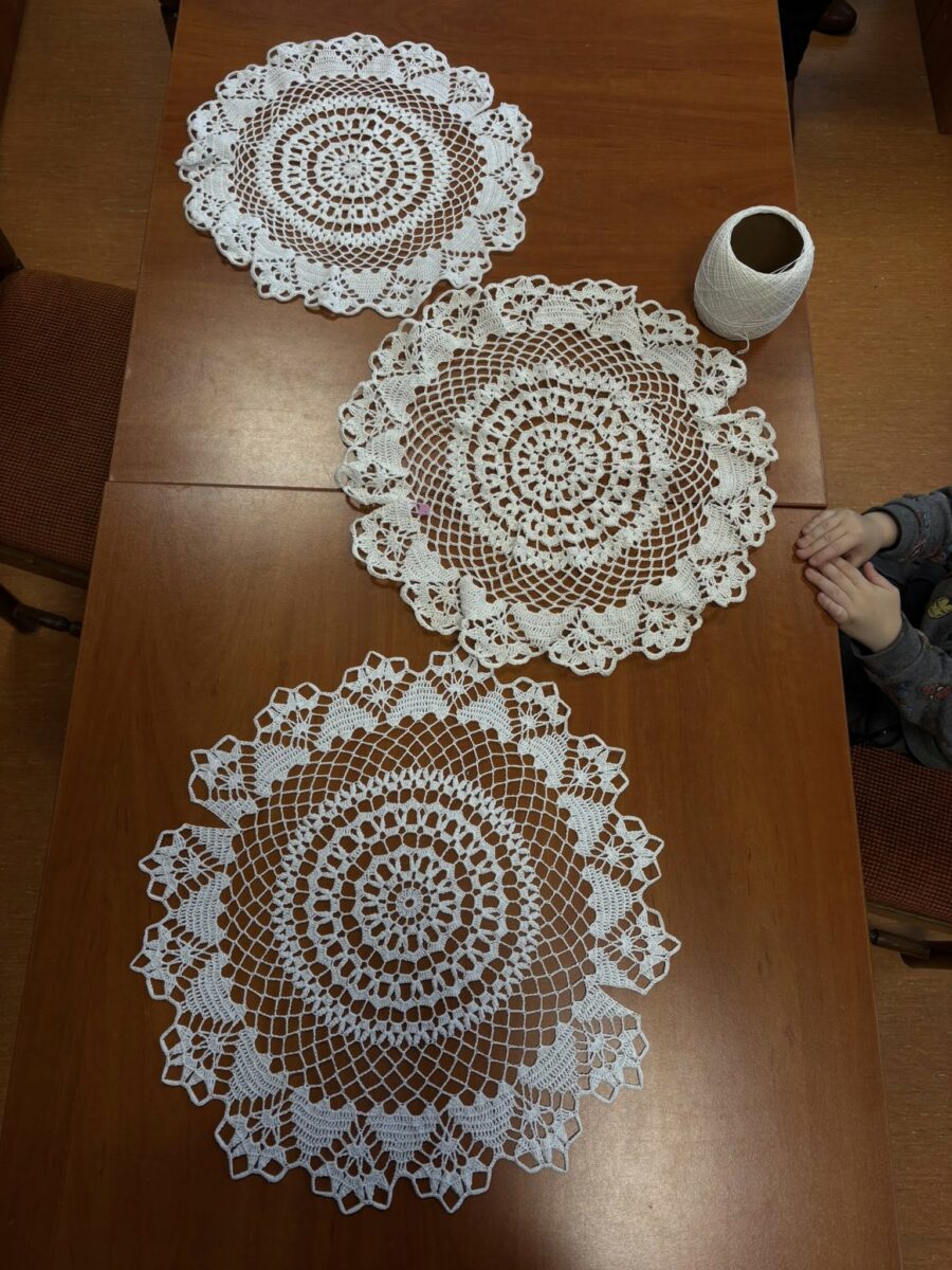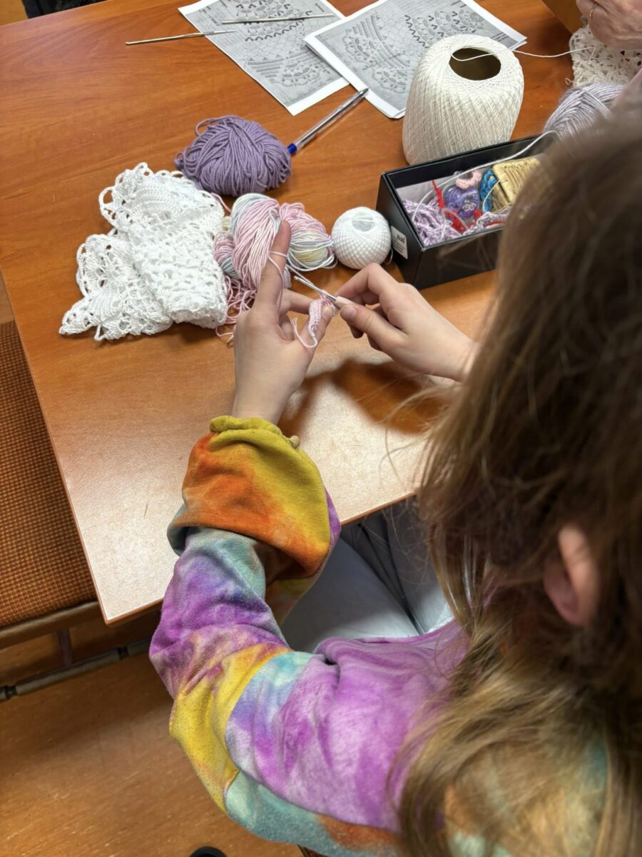 Podczas warsztatów wielkanocnych dzieci i dorośli tworzyli własne pisanki. Każda z nich była niepowtarzalna. Uczestnicy rozmawiali także o tradycjach i symbolice zdobień. Równolegle powstawały szydełkowe serwetki do koszyczków wielkanocnych. Praca ręczna sprzyjała rozmowom i integracji.